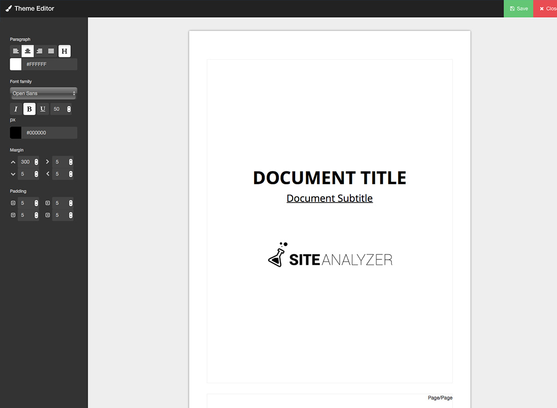 Export your Page Analysis and Crawl reports with Site Analyzer. Create customized and unique PDFs with your colors and your logo thanks to our online Theme Editor. You can export your reports to CSV, printable PDF and landscape PDF (for fullscreen presentation).